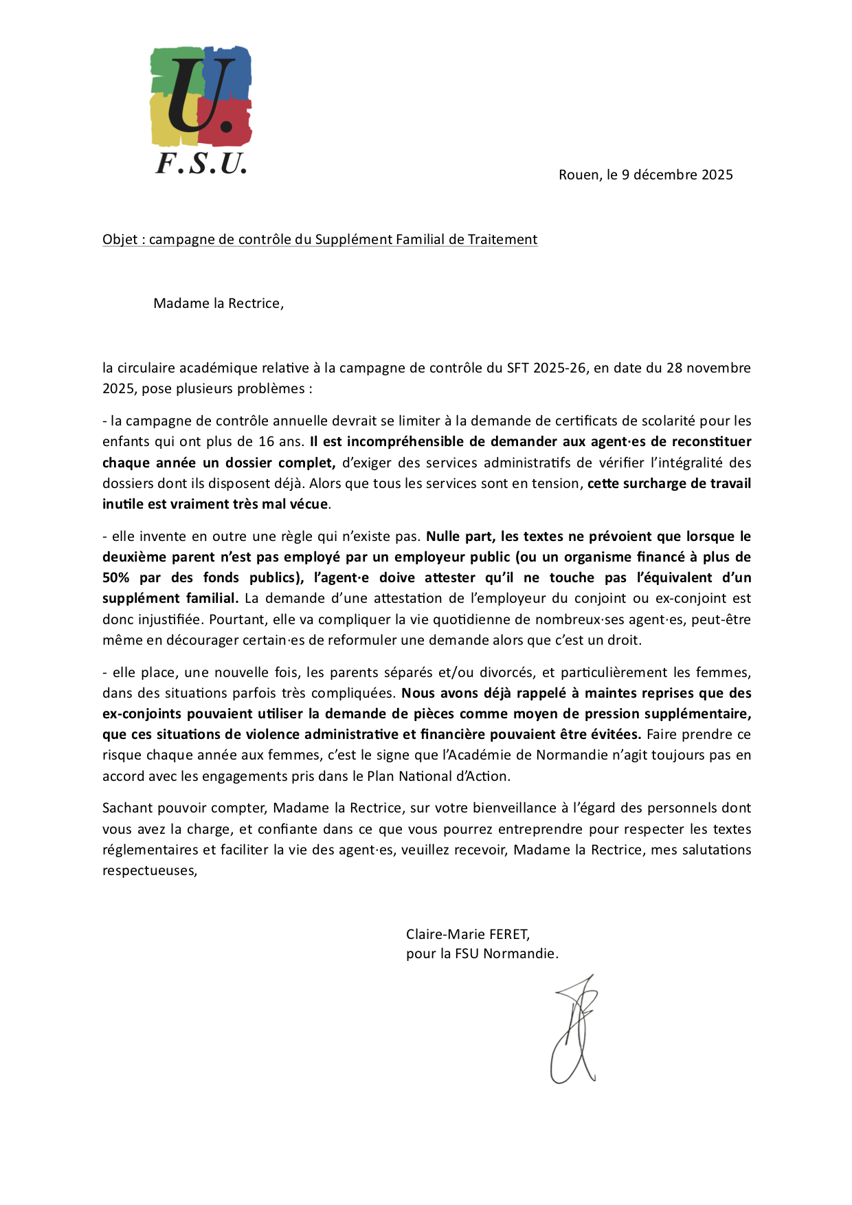 Mais en Normandie, où l’on essaie toujours de faire des économies sur le dos des personnels, la campagne de contrôle, qui devrait consister en une vérification de la scolarité effective des enfants, notamment après 16 ans, est utilisée pour décourager les collègues de faire valoir leur droit et pour les priver de ce SFT. La circulaire invente en effet des conditions d’exclusion et des délais de dépôt de dossier... ainsi, si votre conjointe ou ex-conjointe ne travaille pas pour un employeur public, vous n’avez pas à fournir d’attestation prouvant qu’il ne touche aucun équivalent au SFT. Ceci ne concerne que les fonctionnaires ou assimilées.