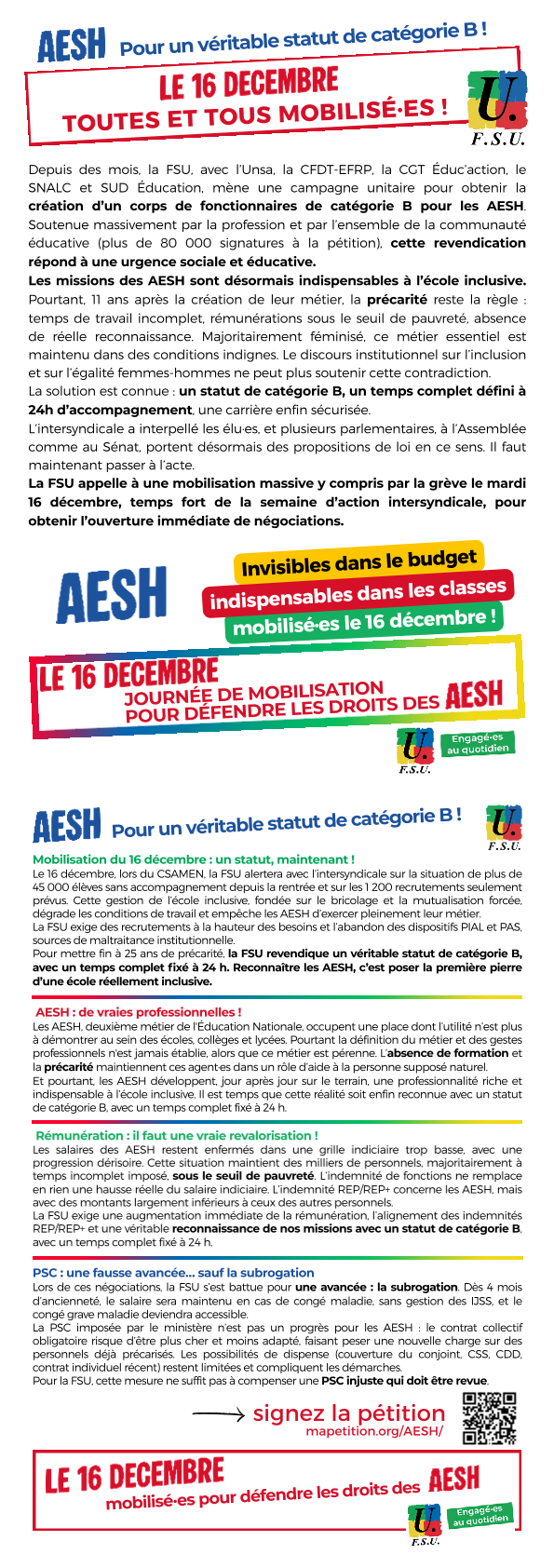 Dans le cadre de la semaine d’action intersyndicale du 15 au 19 décembre pour la création d’un vrai corps de la fonction publique pour les AESH, la FSU rappelle à quel point les conditions de travail et de rémunération des AESH sont dégradées.