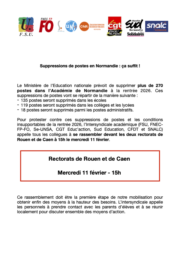 Dès le mercredi 11 février, pour protester contre ces suppressions de postes et les conditions insupportables de la rentrée 2026, l’Intersyndicale académique (FSU, FNEC-FP-FO, Se-UNSA, CGT Educ’action, Sud Education, CFDT et SNALC) appelle tous les collègues à se rassembler devant les deux rectorats de Rouen et de Caen à 15h.